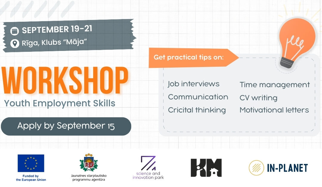 No 19. līdz 21. septembrim Rīgā, jaunatnes Kluba “Māja” telpās notiks intensīvas YES (Youth Empowerment Skills) projekta darbnīcas jauniešiem angļu valodā, kuru mērķis ir sniegt praktiskas zināšanas un prasmes, lai veiksmīgi iekļautos darba tirgū.